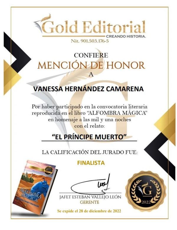 Mención honorífica con el cuento corto: El príncipe muerto.