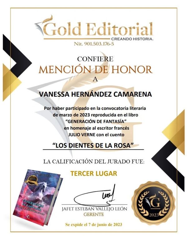 Tercer lugar y mención honorífica con el cuento corto: Los dientes de la rosa.