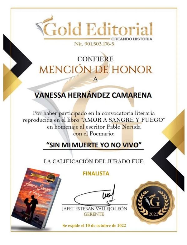 Mención honorífica con poemario: Sin mi muerte yo no vivo.